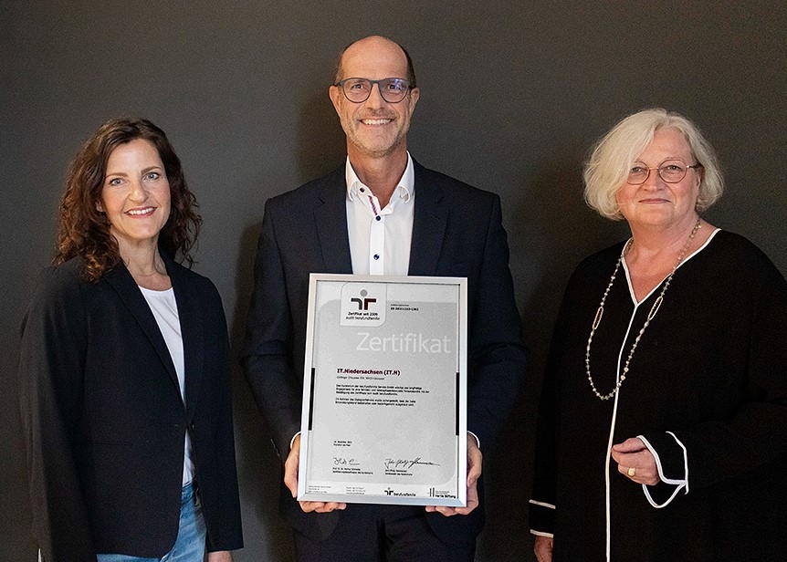 Gleichstellungsbeauftragte Katrin Steffen, IT.N-Geschäftsführer Axel Beims und stellvertretende Gleichstellungsbeauftragte Claudia Frevel (von links) freuen sich über das fünfte Zertifikat in Folge.