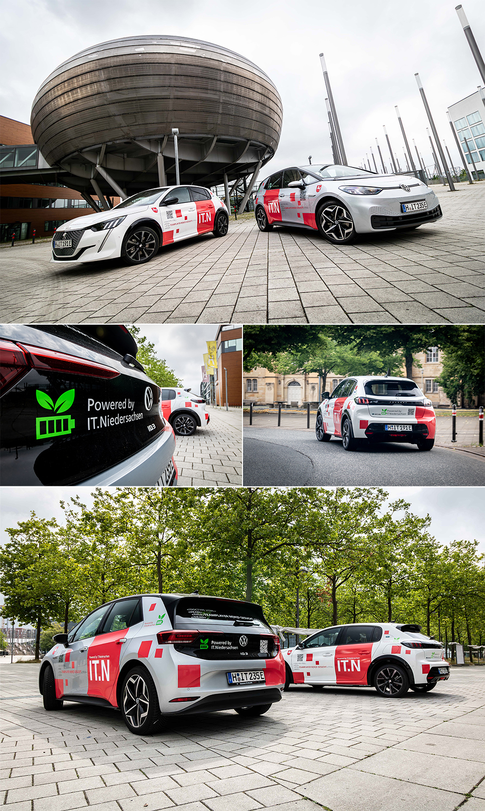 Ein Peugeot e-208 GT und ein Volkswagen ID.3 Pro S mit neuer IT.N-Folierung.