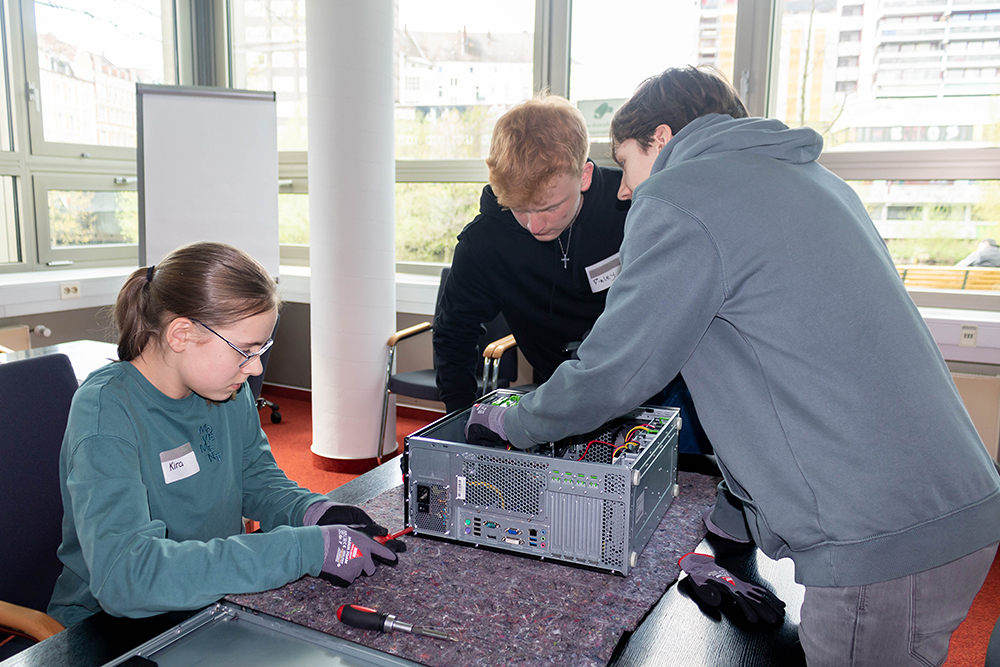 Die zweite Station erfreute sich ebenfalls großem Interesse. Dort standen drei Computer, an denen die Schülerinnen und Schüler einfach mal rumschrauben durften. Hier übernahm Pilaksan Piremkumar die Betreuung, der als Ausbilder für die Fachinformatikerinnen und Fachinformatiker bei IT.Niedersachsen zuständig ist. Er erklärte und zeigte den Kindern die einzelnen Komponenten eines Computers wie etwa den Prozessor, den Arbeitsspeicher, die Festplatte und das Netzteil.