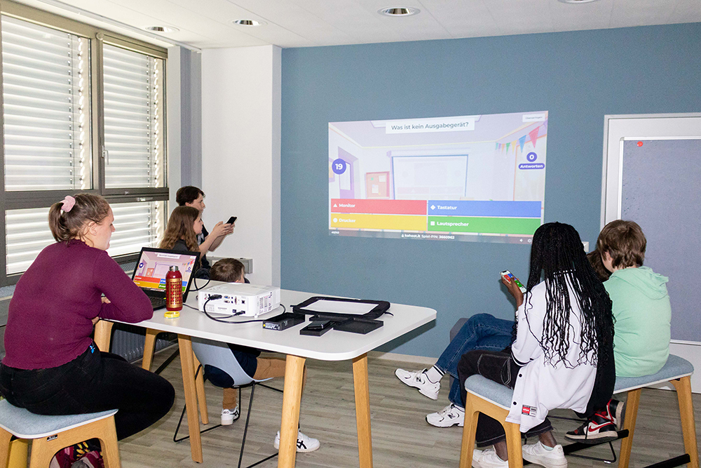 An der dritten Station Carla Charlotte Weinem die jungen Gäste. Die duale Studentin präsentierte ein Quiz mit vielen interessanten Fragen zum Thema IT, bei dem die Schülerinnen und Schüler ihr eigenes Wissen testen und einiges dazulernen konnten. Wie viele Bits hat ein Byte? Wie nennt man ein Computernetzwerk, das ohne Kabel auskommt? Welches Unternehmen gründete Steve Jobs? Dies ist nur eine kleine Auswahl der Fragen, die die Teilnehmenden in Sekundenschnelle über ihr Handy beantworten sollten.