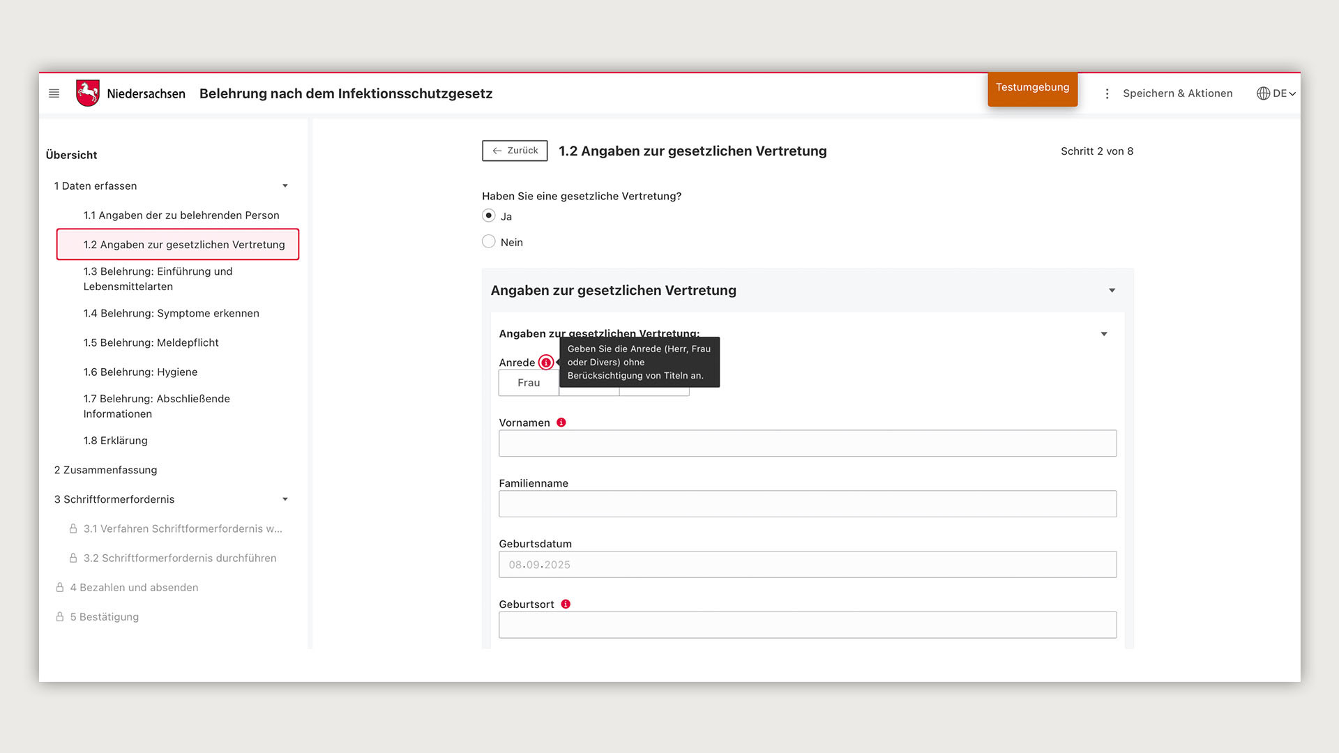 - Korrekt ausgefüllte Felder werden durch ein grünes Symbol bestätigt, automatische Hinweise verhindern Fehler und navigieren die Nutzenden effizient durch den Onlinedienst.