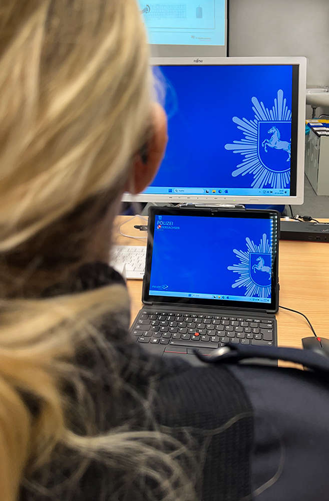 Ob in der Dienststelle, im Homeoffice oder im Einsatzfahrzeug – wir sorgen dafür, dass die niedersächsischen Polizistinnen und Polizisten überall digital arbeiten können. Mit dem PolizeiClient 2.0 stellen wir rund 26.500 Computer bereit. Rund 25.000 davon sind Convertibles: Tablet-Computer mit einer abnehmbaren Tastatur. Sie sind besonders vielseitig einsetzbar. Dank Mobilfunk-Karte und VPN können die Polizistinnen und Polizisten auch unterwegs sicher auf ihre dienstlichen Daten und Anwendungen zugreifen und beispielsweise Kennzeichen überprüfen, Personendaten abfragen oder Berichte schreiben. Im Büro oder im Homeoffice schließen sie die Geräte über eine mitgelieferte Dockingstation an größere Monitore an.